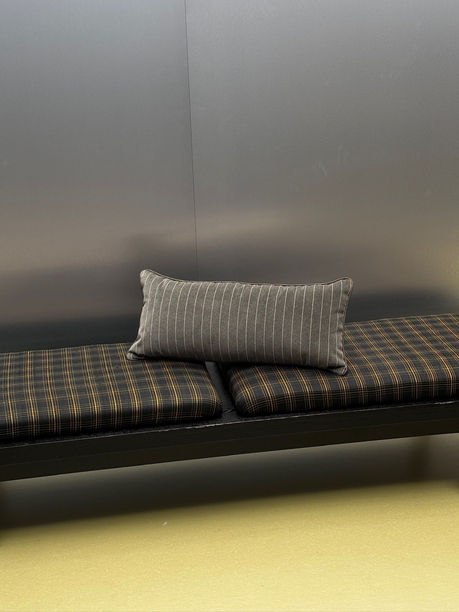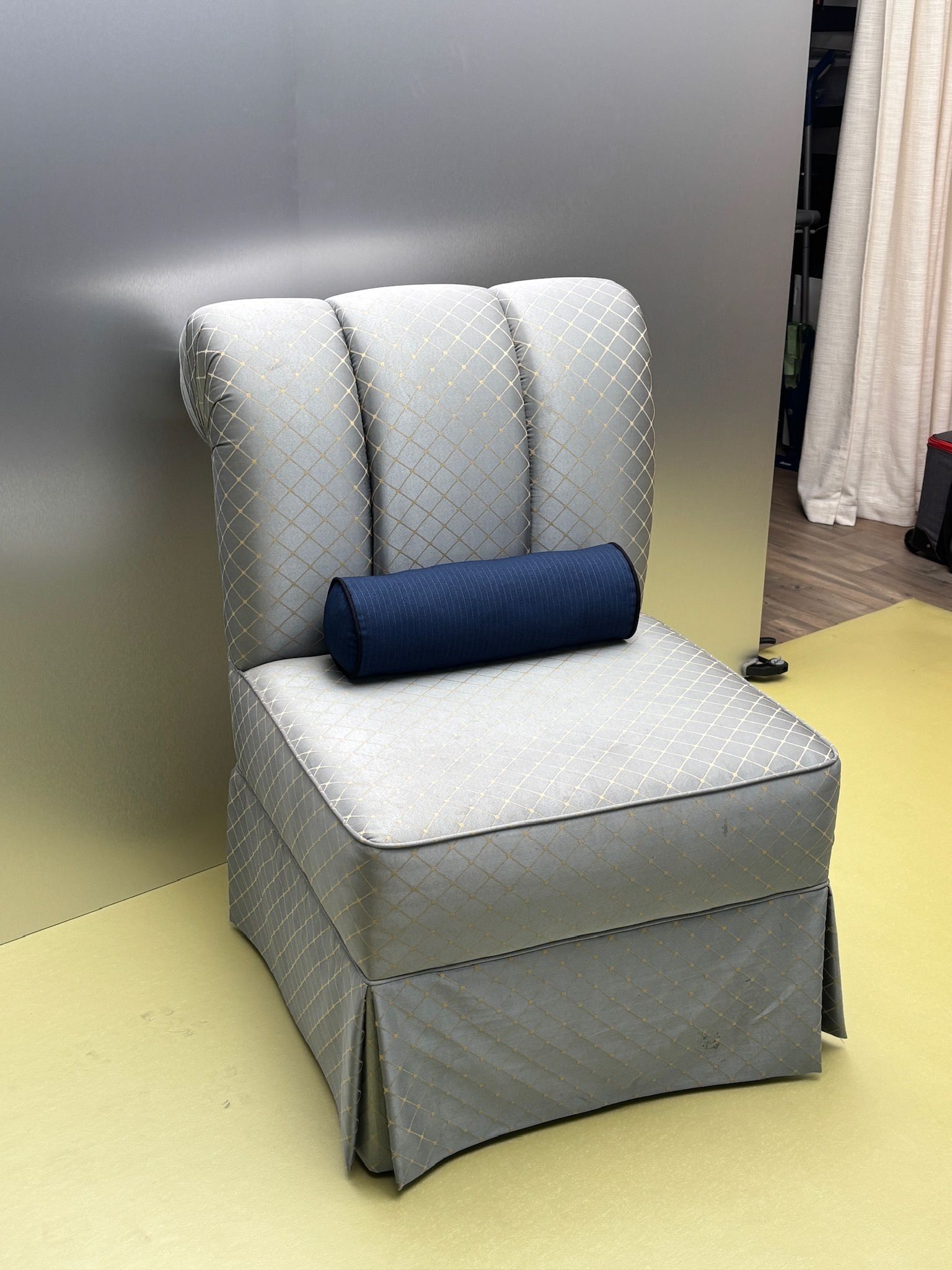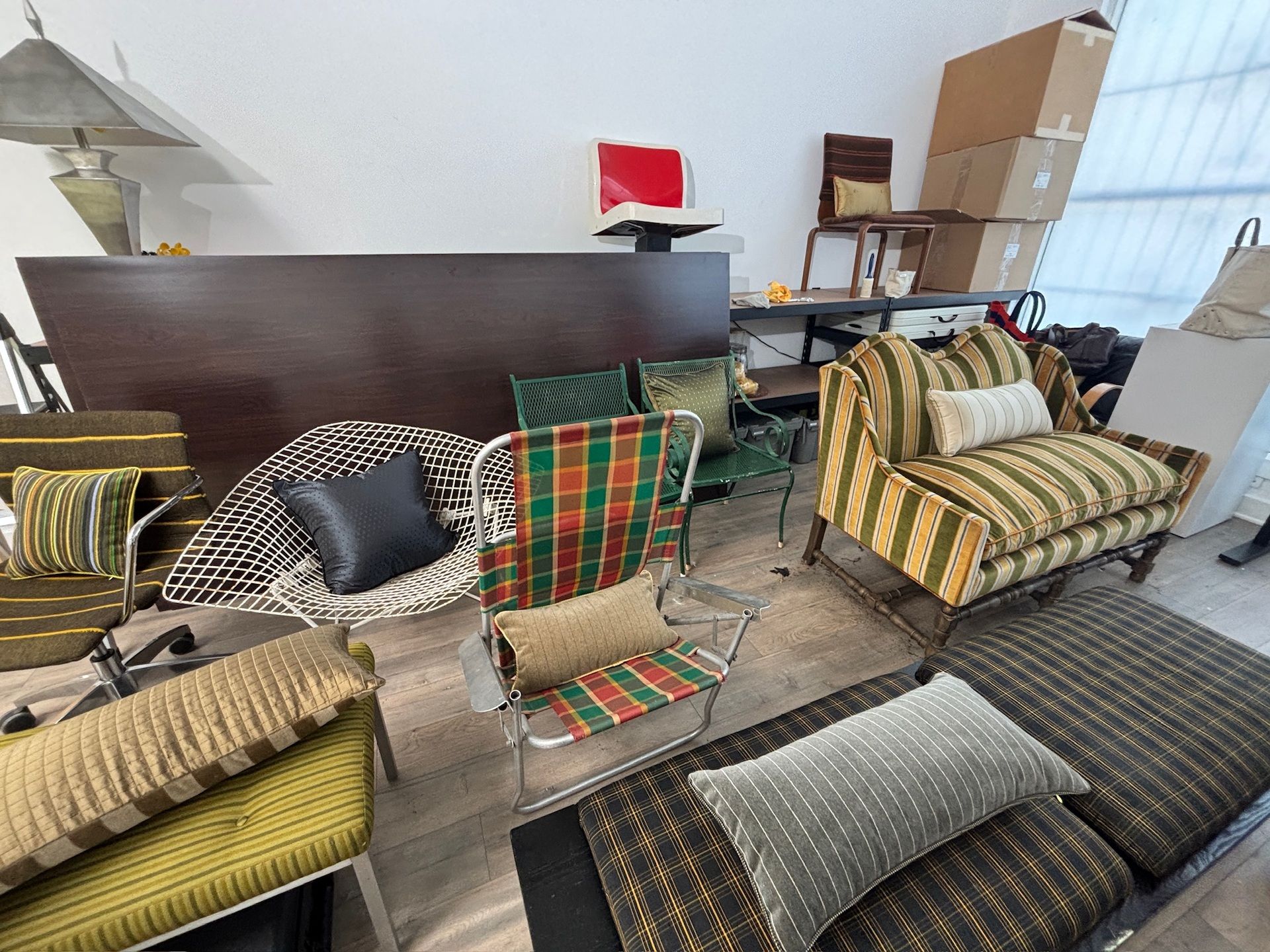 Props for a pillow shoot might sound like an afterthought, but when you're photographing fifteen pillows, you need fifteen surfaces. I'm talking chairs, benches, stools, settees, whatevs. Usually, I rent from Gil & Roy, which is the coolest editorial-style prop house in LA. Their stuff is unreal. But now that I have my own vintage shop, Office Supplies, I thought: why not thrift, reupholster, and use pieces we can actually sell later?